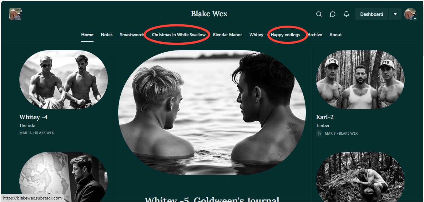 So far, I’ve created sections for the short novel “Christmas in White Swallow,” one for “Whitey,” which is still in progress, one for “Blendar Manor”: my free offering, and one for “Happy Endings,” a collection of standalone short stories in one or two chapters.