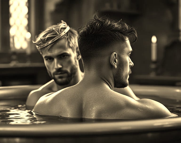 The usual tub had been replaced by a much larger, gilded one, and to my surprise, Hardon was in it, as far as I could tell, naked except for a small crown tightly sitting on his head, catching the candle light.